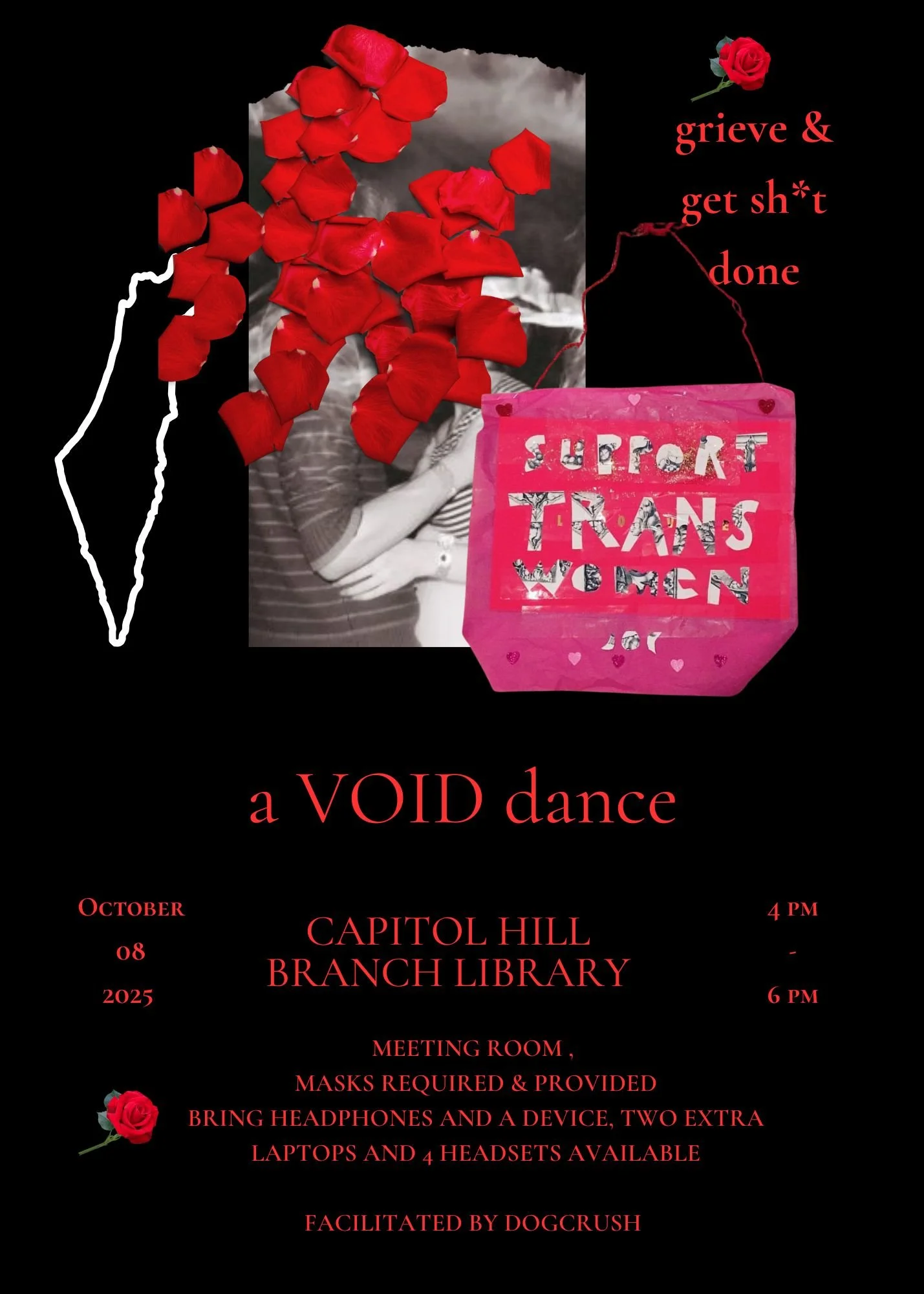 A community grief and action gathering held at the local library. Participants alternated between mutual aid and embodied release — writing to representatives, supporting humanitarian efforts, and then dancing with headphones on. The event invited collective regulation through movement, accountability, and care, with masks and clean air provided to protect disabled and immunocompromised participants.
